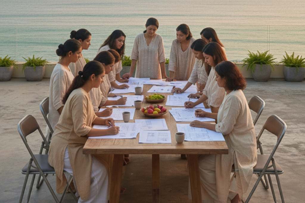 We close the morning with a curated gourmet breakfast in a serene, aesthetic seaside space. Warm ambience. Conversation. Integration. Belonging. This is nourishment for the heart as much as the body - a soft landing after a powerful energetic morning.
